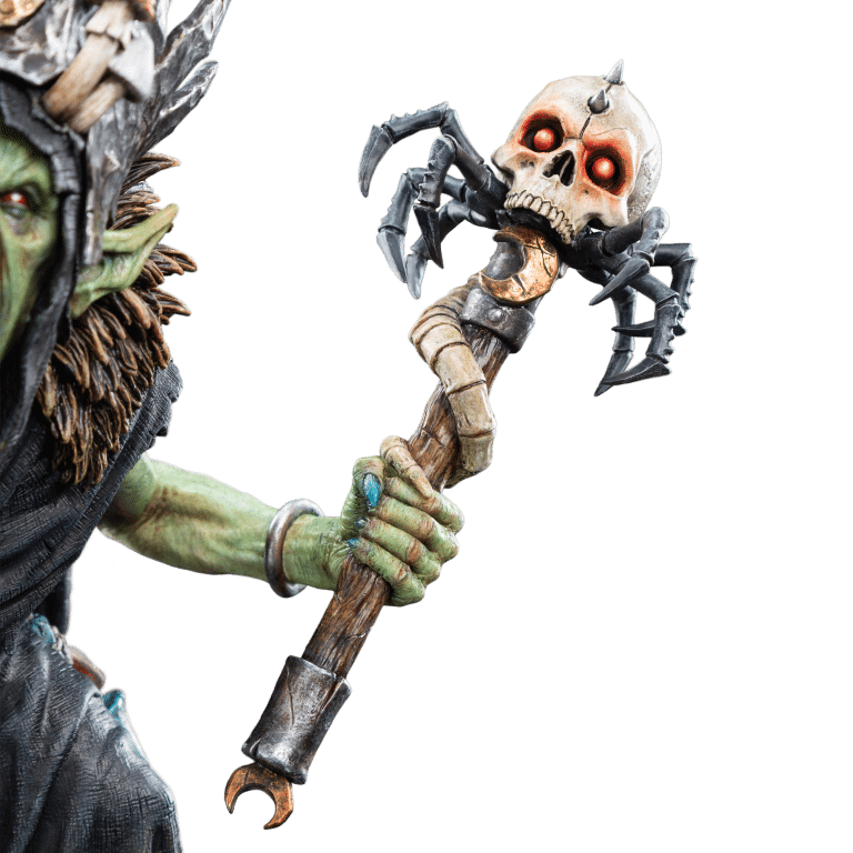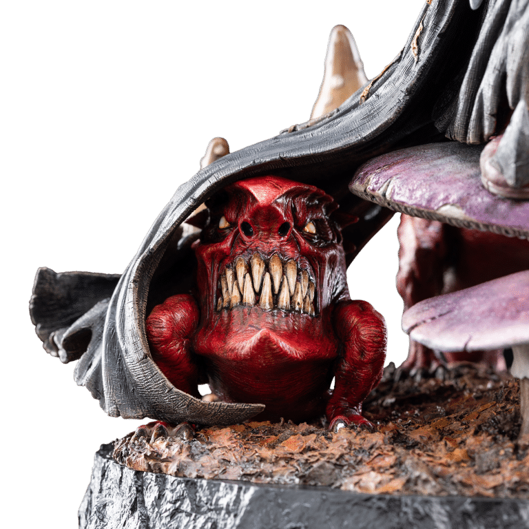 Every inch of this masterpiece captures the essence of his dark power—his staff, adorned with twisted mushrooms and ritualistic fetishes, stretches high into the air, while his regal yet malevolent presence demands attention. The intricate textures, from the sculpted fungi to the jagged crown, showcase the exceptional artistry of our artisans, particularly that of Daniel Cockersell, who traditionally hand-sculpted this stunning piece physically out of clay.