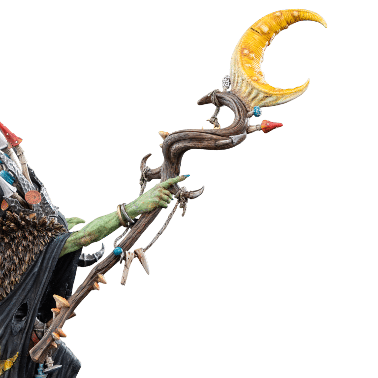 In Warhammer Age of Sigmar, the Mortal Realms are filled with epic battles, ancient magic, and monstrous creatures. The forces of Order, Chaos, Death, and Destruction each vie for dominance in a conflict with no end in sight. From vast cities to war-torn wilderness, power and bloodshed reign supreme. Beneath his tattered robes and fungal finery, Skragrott’s power seethes like a cursed elixir. His gaze turned ever skyward, yearning for the cold, unfathomable twilight of the Bad Moon that spoke to him once before. That fateful communion left him more than a prophet—it left him a king, feared and reviled by Gitz and enemies alike. Yet, the Loonking is not content. Obsession consumes him, a relentless hunger that gnaws at his very core. He will tear the realms asunder, crushing all who dare stand in his way. Nothing will stop him from hearing the Bad Moon’s dark whispers once more. Nothing. “Crafted with masterful precision and an unwavering dedication to detail, this premium collectible statue brings to life the twisted majesty of Skragrott the Loonking, from Warhammer Age of Sigmar.
