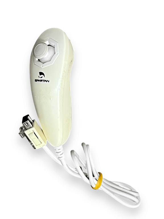GENUINE SPARTAN Wii Nunchuk / Wii Nunchuck for use with Nintendo Wii. Preowned nunchuck in perfect working order, with some yellowing of the show is a purely cosmetic imperfection.