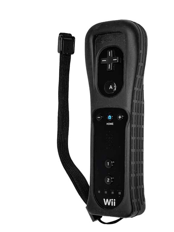 Official NINTENDO Wii Remote (Controller) BLACK EDITION complete with Silicone Rubber Protective Sleeve and Safety Strap. This preowned controller is in good condition and perfect working order, and comes complete with battery hatch.
