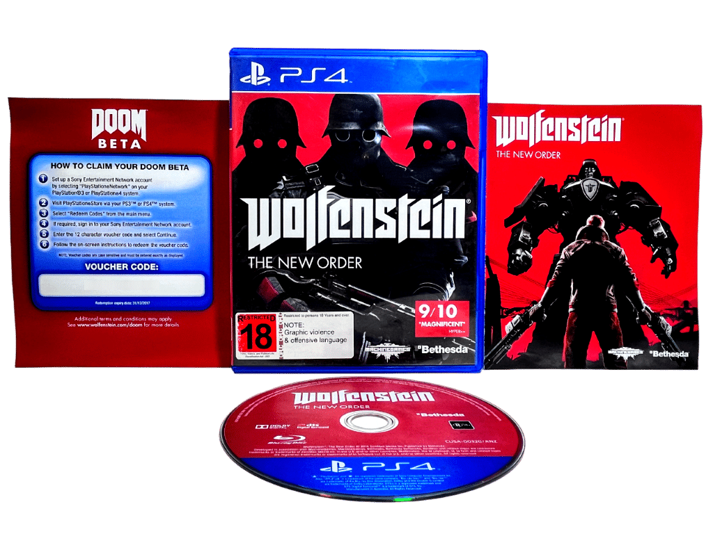 Excellent Condition & 100% Complete with Contents: WOLFENSTEIN THE NEW ORDER for SONY PlayStation 4 / PS4. This preowned game comes complete with case, cover, manual / booklet, and game disc. Voucher card not included, but this was promotional download only and is not required for gameplay or completion. The FULL Wolfenstein The New Order game is included on the game disc, without any promotional downloads.