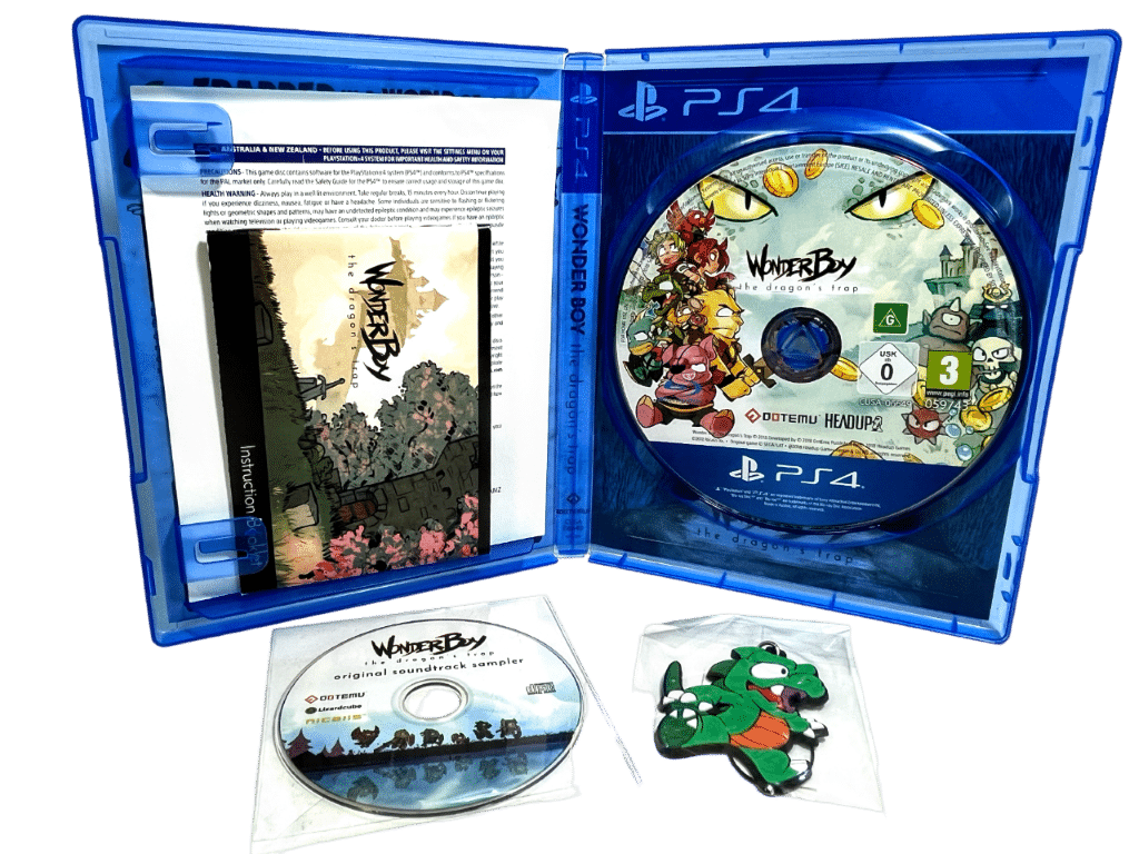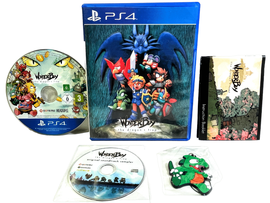Mint Condition & 100% Complete with ALL Contents, including Brand New Sealed Dragon accessory + New Sealed Wonderboy Original Soundtrack Sampler disc + Wonderboy Artbook: WONDER BOY THE DRAGON’S TRAP for SONY PlayStation 4 / PS4. Preowned but LIKE NEW – this preowned game is a tidy and complete collector’s item, with the collectibles inside case with official game disc + Double-Sided cover + carded insert. Refer photographs, and add this to your PS4 games collection today.