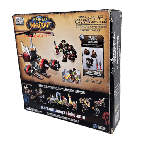 From World of Warcraft by Mega Bloks, build and customize the Alliance Flying Machine, a mechanical zoomer mount. Includes Flint, the tricky Gnome Rogue who rides his Flying Machine throughout Azeroth! Flint features interchangeable gear, including complete leather armor and dual-attack daggers.