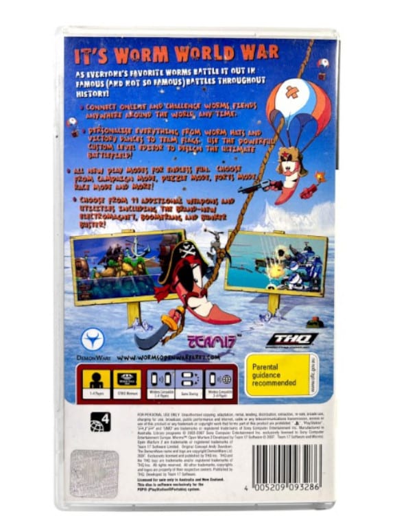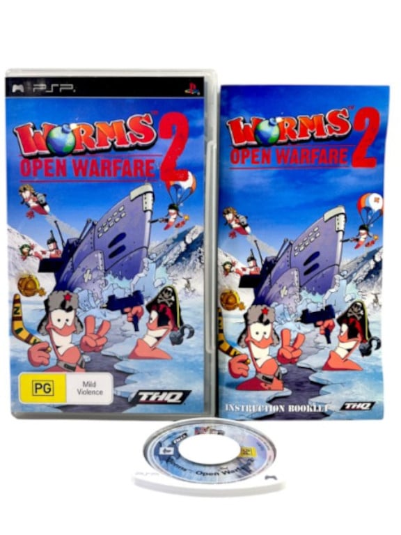 WORMS Open Warfare 2 for SONY PlayStation Portable / PSP. This preowned game is in excellent condition, and comes complete with case, cover, manual / booklet, and game disc inside its miniature UMD case.