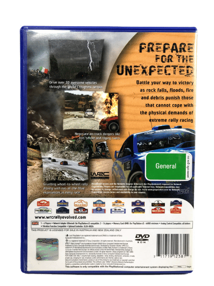 The Original Edition (“Black” Edition – Blue Case) 100% complete with contents: WRC RALLY EVOLVED / World Rally Championship Rally Evolved for SONY PlayStation 2 / PS2. This preowned game comes complete with case + authentic Original Print cover + manual / booklet + game disc. Game has slight cosmetic scratches that do not affect gameplay.