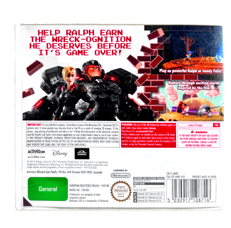 Excellent Condition & 100% Complete with Contents: WRECK-IT RALPH / WRECKIT RALPH / WRECK-IT-RALPH for NINTENDO 3DS. This preowned game comes complete with case + cover + manual / booklet + game cartridge.