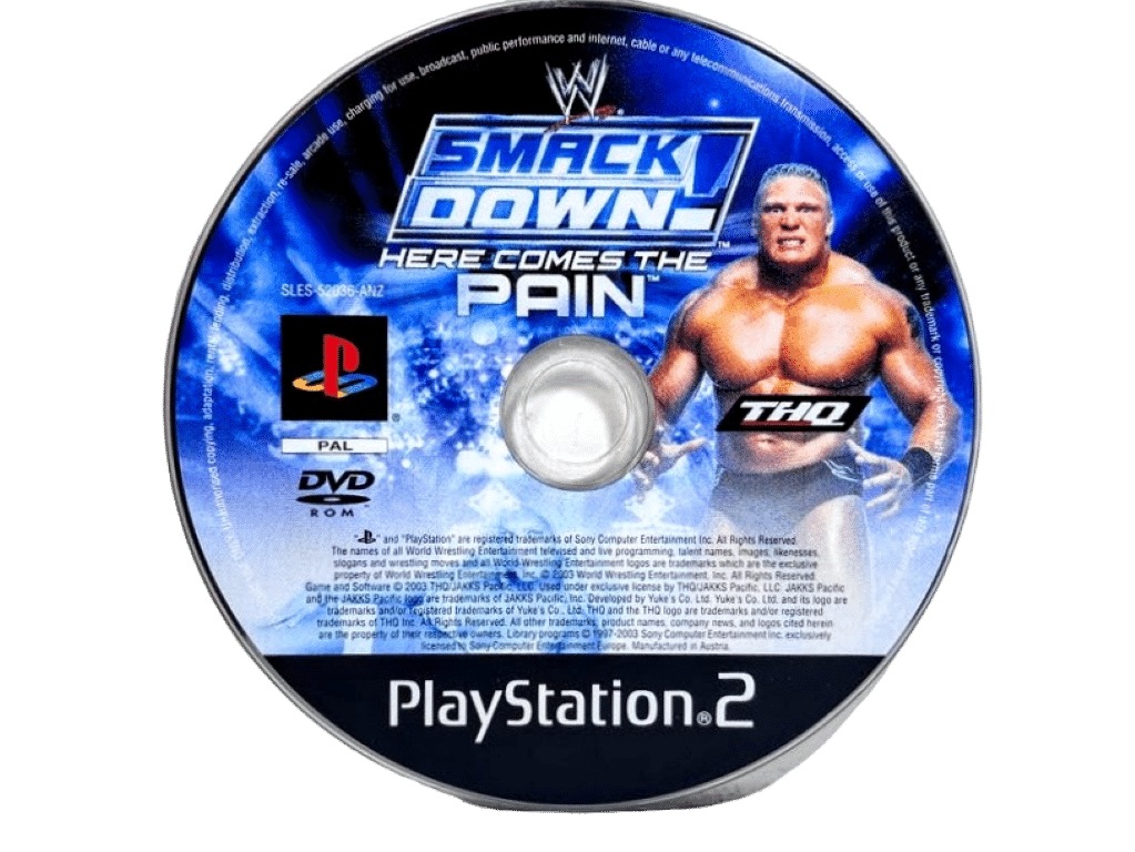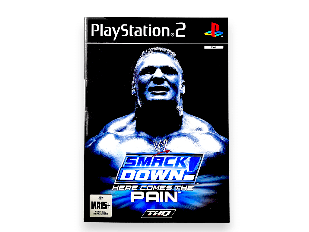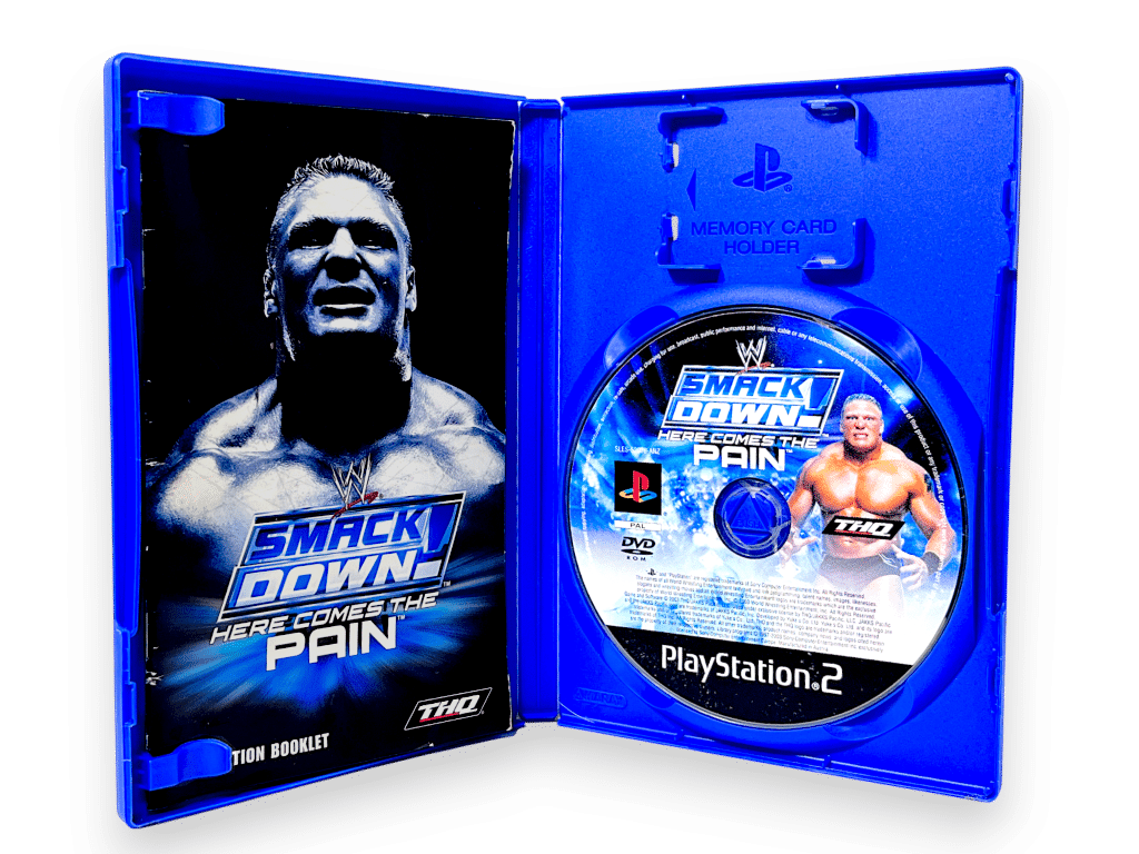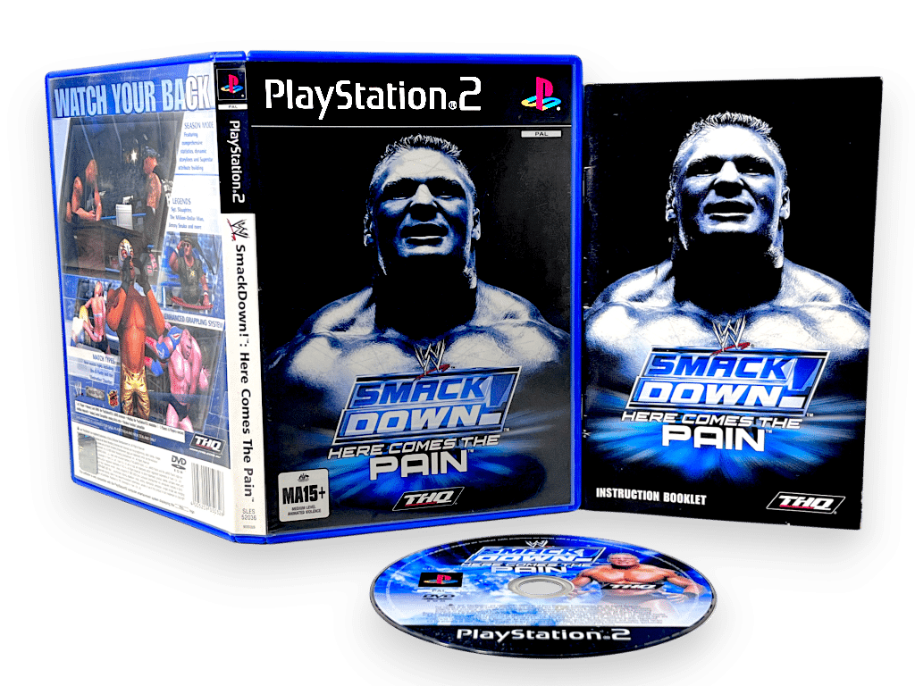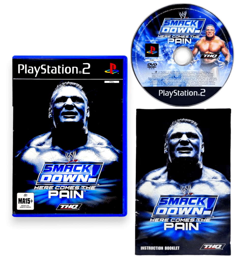 The ORIGINAL PRINT “BLACK” LABEL EDITION in excellent condition & 100% complete with contents: WWE Smackdown Here Comes the Pain (Featuring BROCK LESNAR & More!) for SONY Playstation 2 / PS2. This preowned game cis in superb condition and includes original case + cover + instruction manual / booklet + game disc.