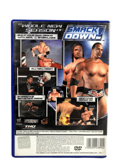 In one corner stands the immortal Hulk Hogan®. In the other stands the Undisputed World Wrestling Champion Triple H. Tensions mount, but suddenly Y2J’s music blares as he enters the arena and grabs the mic. Fans boo and chant “has-been”! Backstage, The Great One gets ready to layeth the smacketh down while Mr. McMahon sits with his personal assistant Stacy Keibler. It’s SmackDown! as you’ve never seen it before for the PlayStation 2. All-new Superstars, enhanced season mode and more matches then ever.