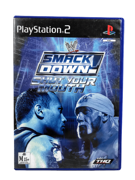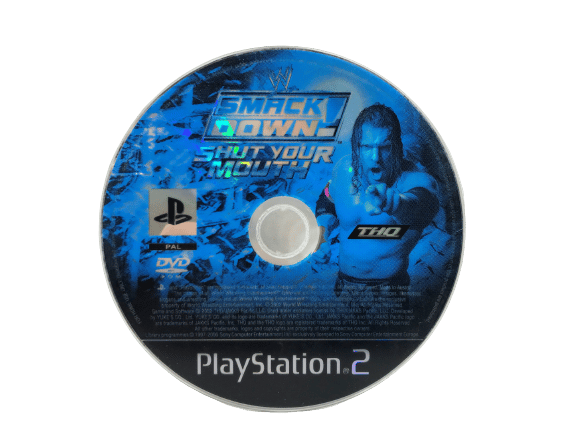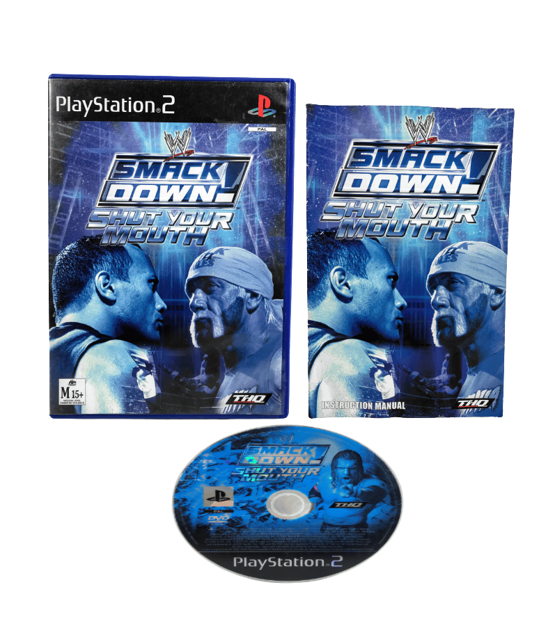 RARE WWE Game Good Condition & 100% Complete with Contents: WWE Smackdown SHUT YOUR MOUTH for SONY PlayStation 2 / PS2. This preowned game comes complete with case + cover + manual / booklet (each in superb condition) + game disc. Some very fine superficial markings / cosmetic scratches, but these are purely cosmetic imperfections which do not affect game play in any way.