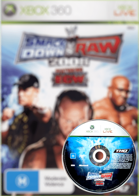 WWE Smackdown vs. Raw 2008 for XBox 360. This preowned game disc is in excellent condition. Disc comes inside an empty blank case. Please note that the original case is NOT included.