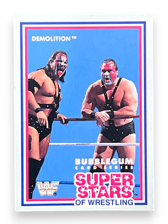 Vintage WWF Superstars of Wrestling bubblegum card showcasing DEMOLITION. Part of the iconic trading card run that captured wrestling’s golden era, featuring bold photography and classic WWF branding.