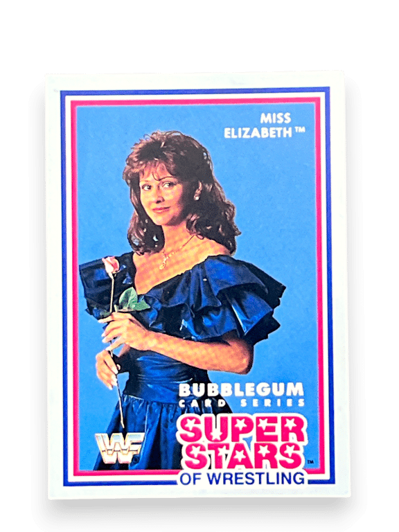 WWF Superstars of Wrestling bubblegum trading card featuring Miss Elizabeth. A highly recognisable figure in wrestling history, this card is a standout piece for collectors of classic WWF personalities and vintage trading cards.