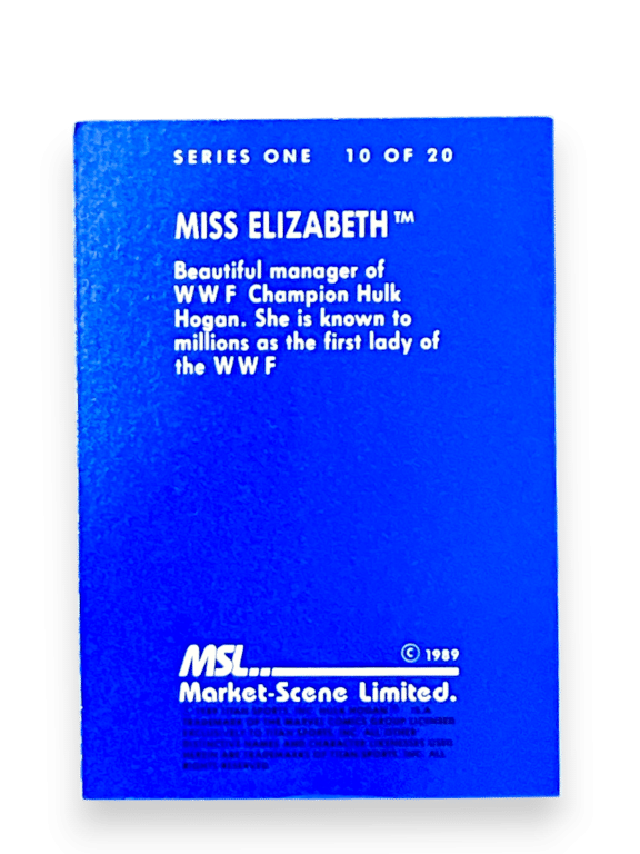 WWF Superstars of Wrestling 1989 SERIES 1 Card Miss Elizabeth. RARE FIND: EXCELLENT CONDITION – GENUINE 1989 SERIES 1 WWF SUPERSTARS OF WRESTLING BUBBLEGUM COLLECTOR’S CARD. This pre-owned official Series 1 collectible card is in excellent condition as pictured. We had a succession of these Series 1 cards traded in this week, all from the same collector and all are in the same superb condition. Refer photographs.