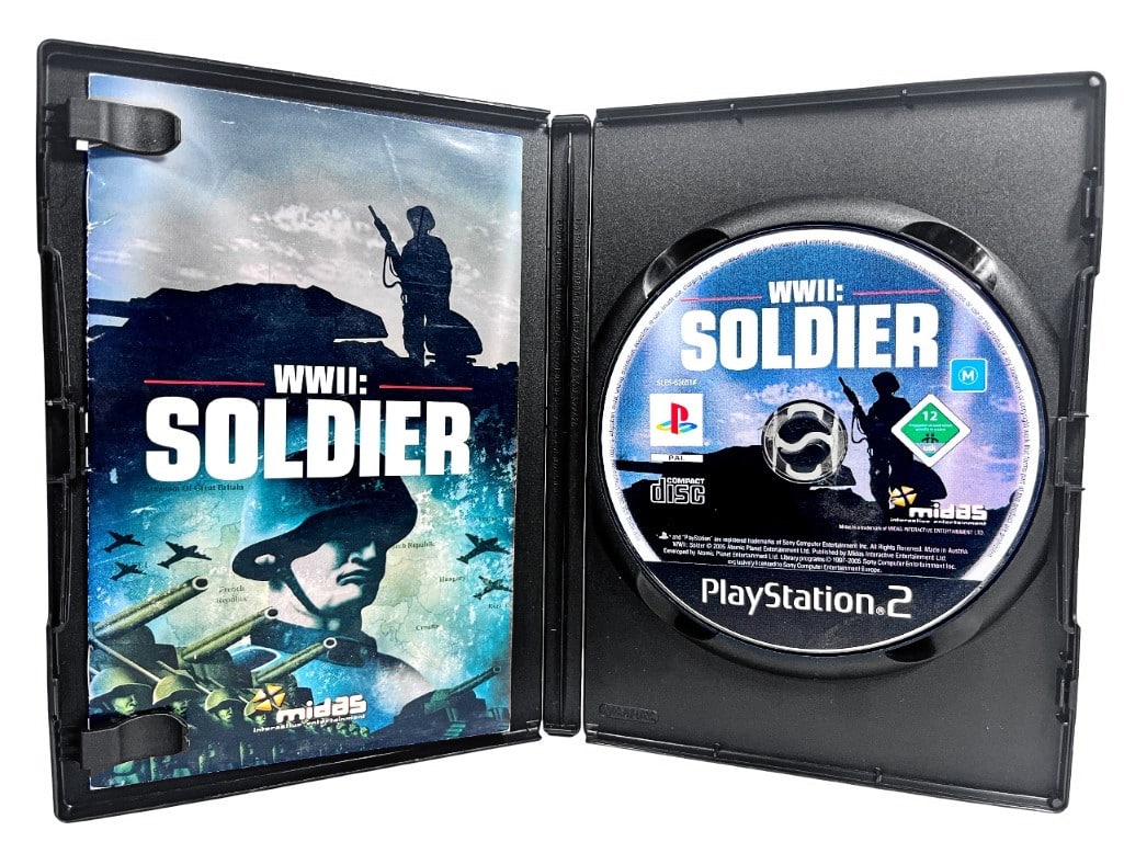 WORLD WAR 2 SOLDIER for SONY PlayStation 2 / PS2. This preowned game is in very good condition and includes case + manual / booklet + game disc. Case is a Black DVD case. Note that the original paper cover is NOT included, but the manual looks equally impressive in its place as pictured.
