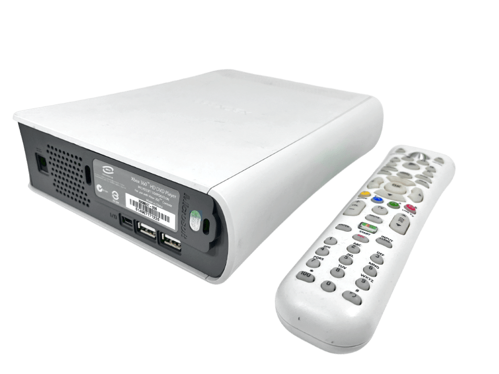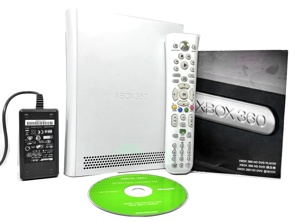 Rare Genuine Microsoft XBox 360 HD DVD Player in excellent condition and complete with instructions and remote. This preowned Genuine Microsoft XBox 360 HD DVD Player is a rare item in itself, let alone in this condition with instructions and remote. Excellent condition with superficial markings only. Booklet has some minor paper staining on the front cover, but this is purely cosmetic, and the hardware / remote are each superb. Refer photographs.
