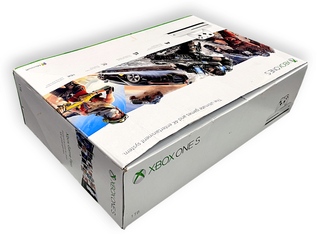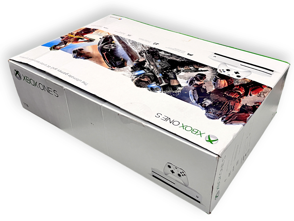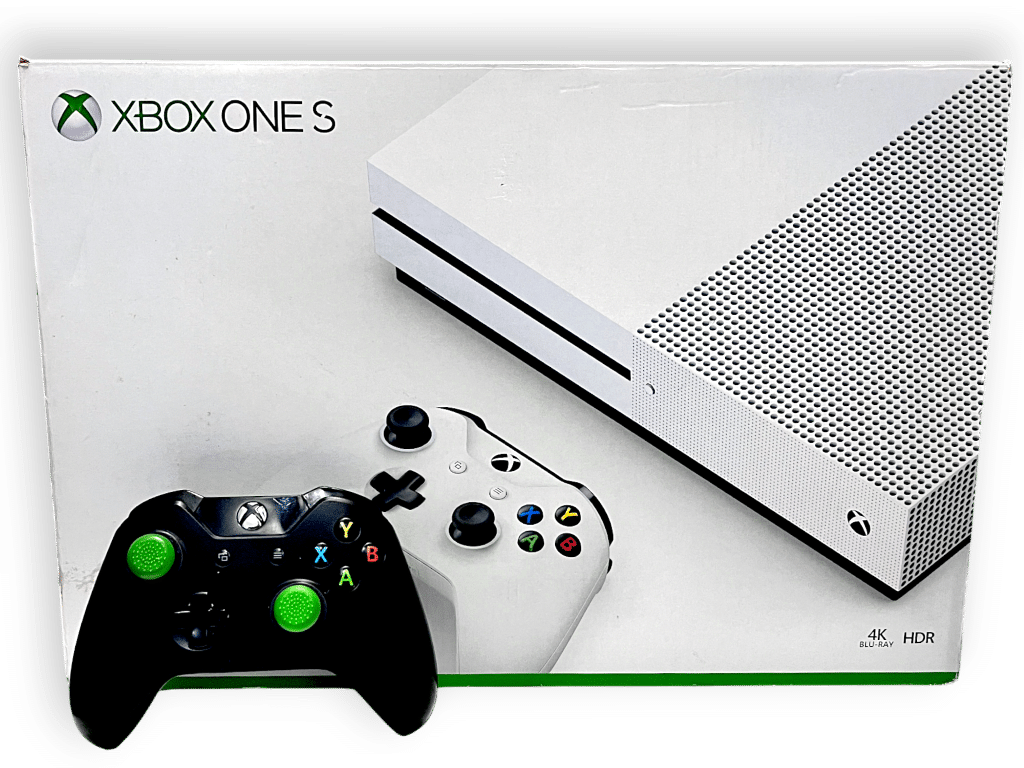 Xbox One S Console 1TB (Xbox One) BOXED. Pre-owned Xbox One console box set in good condition and perfect working order. Note that the controller is black instead of white. Controller has replacement green thumbgrips stuck on tips (fixed in place). Console in perfect working order, with expected mild markings and cosmetic imperfections over the white surface, but nothing that hinders its perfect performance or functionality in the slightest. Box in good condition. Refer photographs.