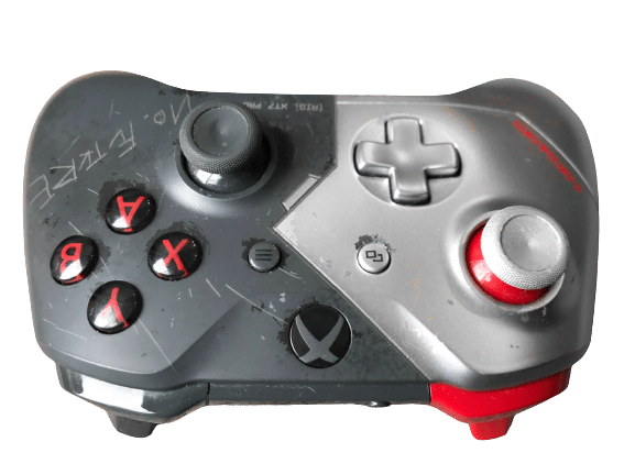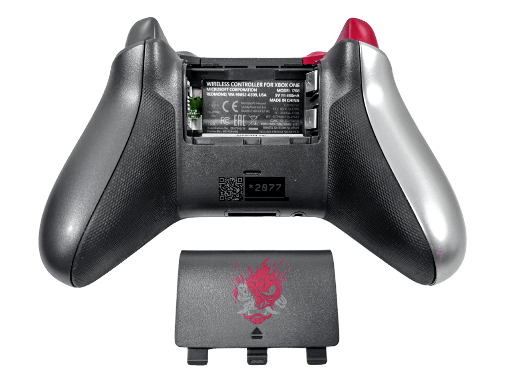 Xbox One Wireless Controller – Cyberpunk 2077 Limited Edition. This preowned controller is in very good condition and perfect working order and includes a white Nyko removable battery hatch cover on the back. Takes two AA batteries, and the batteries are sold separately. Slight yellowing of the white analogue stick, but the rubber is all intact, and the controller is certainly functioning perfectly on all fronts, fully tested using our analytics in-store. A reliable controller that will not let you down.