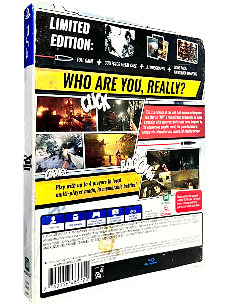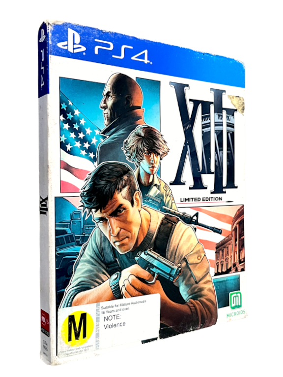 XIII Limited STEEL CASE COLLECTOR’S BOX SET for SONY PlayStation 4 / PS4. This preowned authentic limited steelbook collector’s edition is in good condition – all inner contents are Excellent. Steelbook has a small indentation. Paper cover has some pictured paper wear, but still displays well.