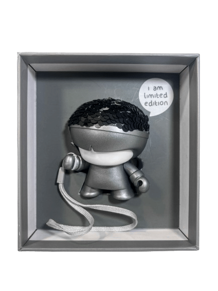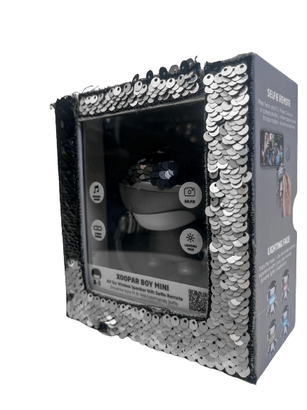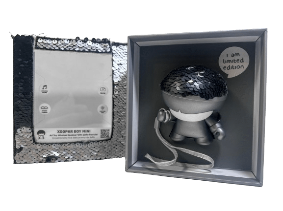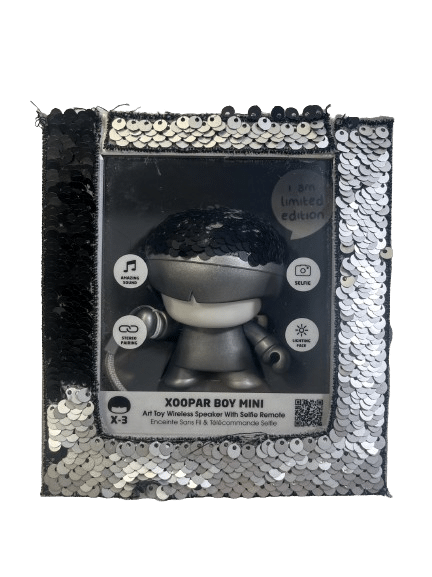 Xoopar Mini Boy Silver Glitter Bluetooth Speaker. This preowned item is in excellent condition inside original box.