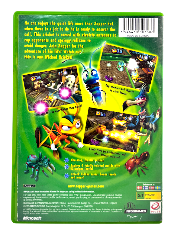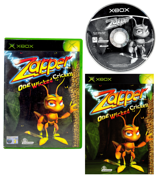 Genuine Original Print in excellent condition: Zapper: One Wicked Cricket! for Original XBox. This preowned game is in very tidy condition and includes case + cover + game disc. The faintest of superficial markings / cosmetic scratches, but these are so subtle that they are really only visible under reflective light when you are holding the game under your nose. The game disc is in excellent condition. The only notable imperfection I could find was on the paper cover at the very bottom of the spine section where I spotted a tiny paper tear (not a piece missing – just the white line approx 2cm long indicating a small tear at the very base on one edge), and this a purely cosmetic imperfection, not visible from the front. Please note that the MANUAL IS NOT INCLUDED in this listing, but the game is self-explanatory, and the instructions are readily available online.