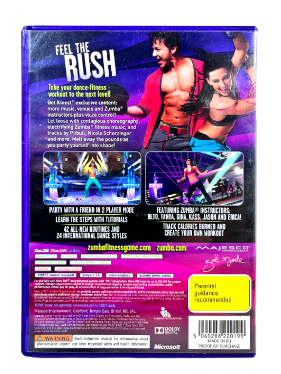 Get a total body workout with 42 electrifying new routines and music tracks (10 exclusive to Kinect), now featuring hits from today?s hottest artists along with contagious Zumba originals that let you lose yourself to the music.